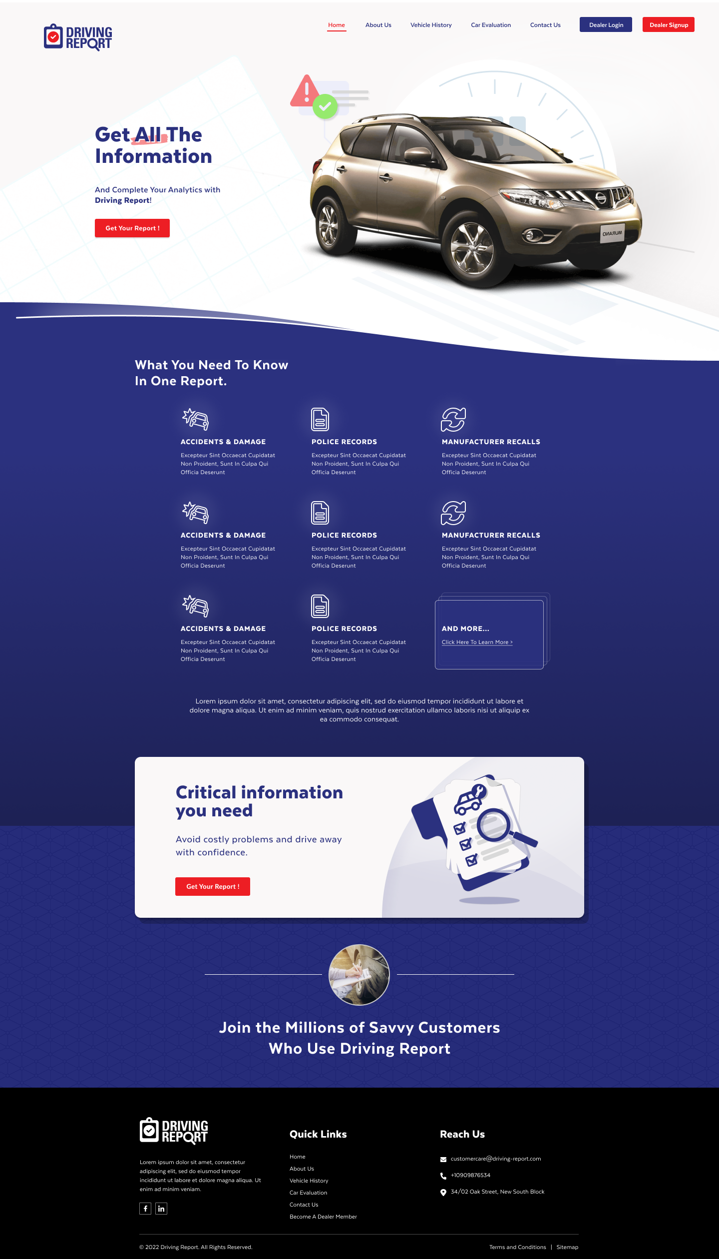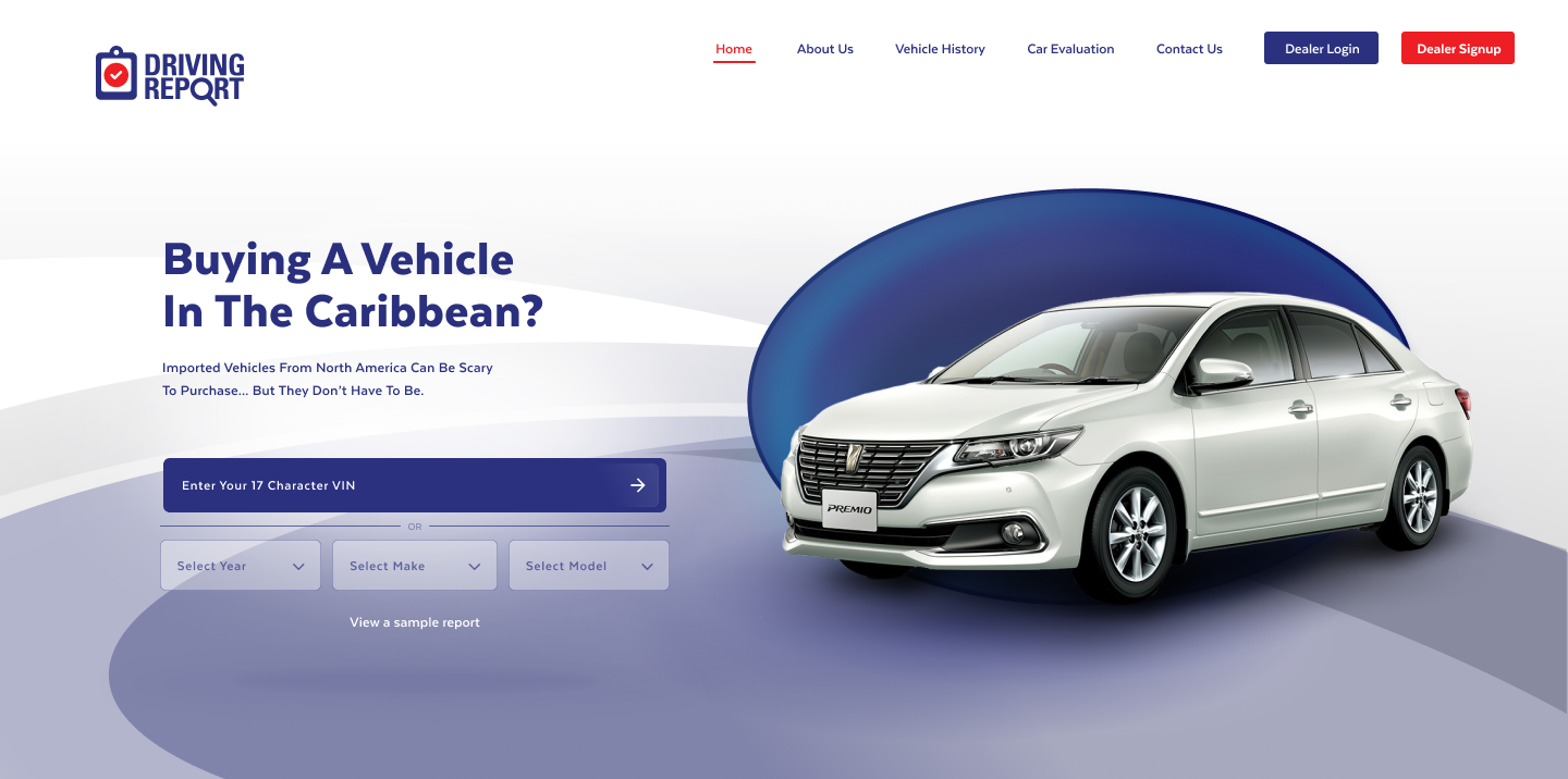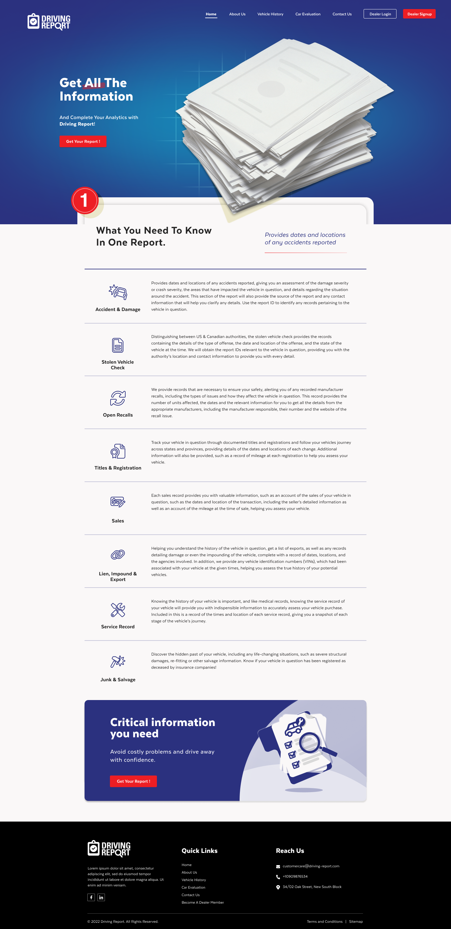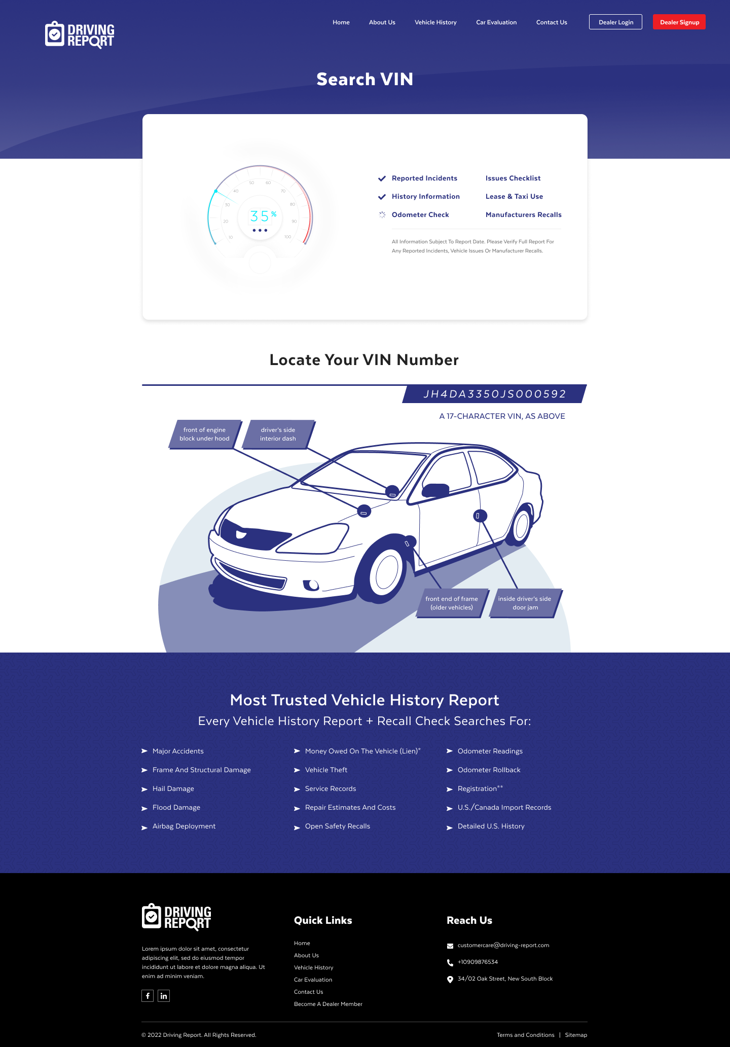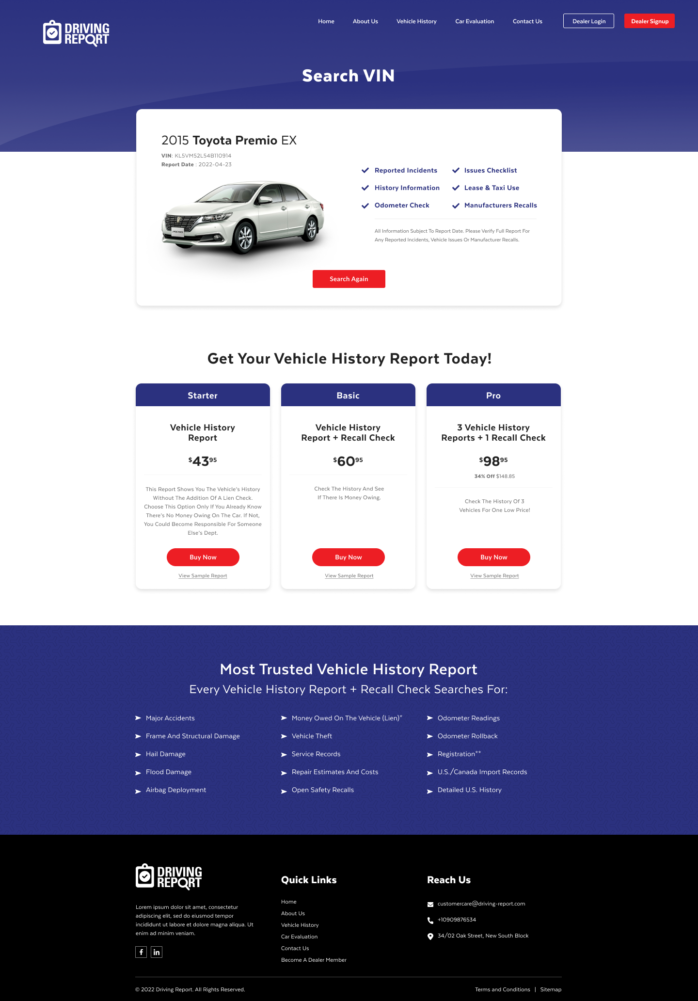 Public-facing responsive pages, configured for both mobile and desktop, featuring a user-interface application and dynamic reports, providing customers with a system to retrieve, store and view detailed reports on selected vehicles.