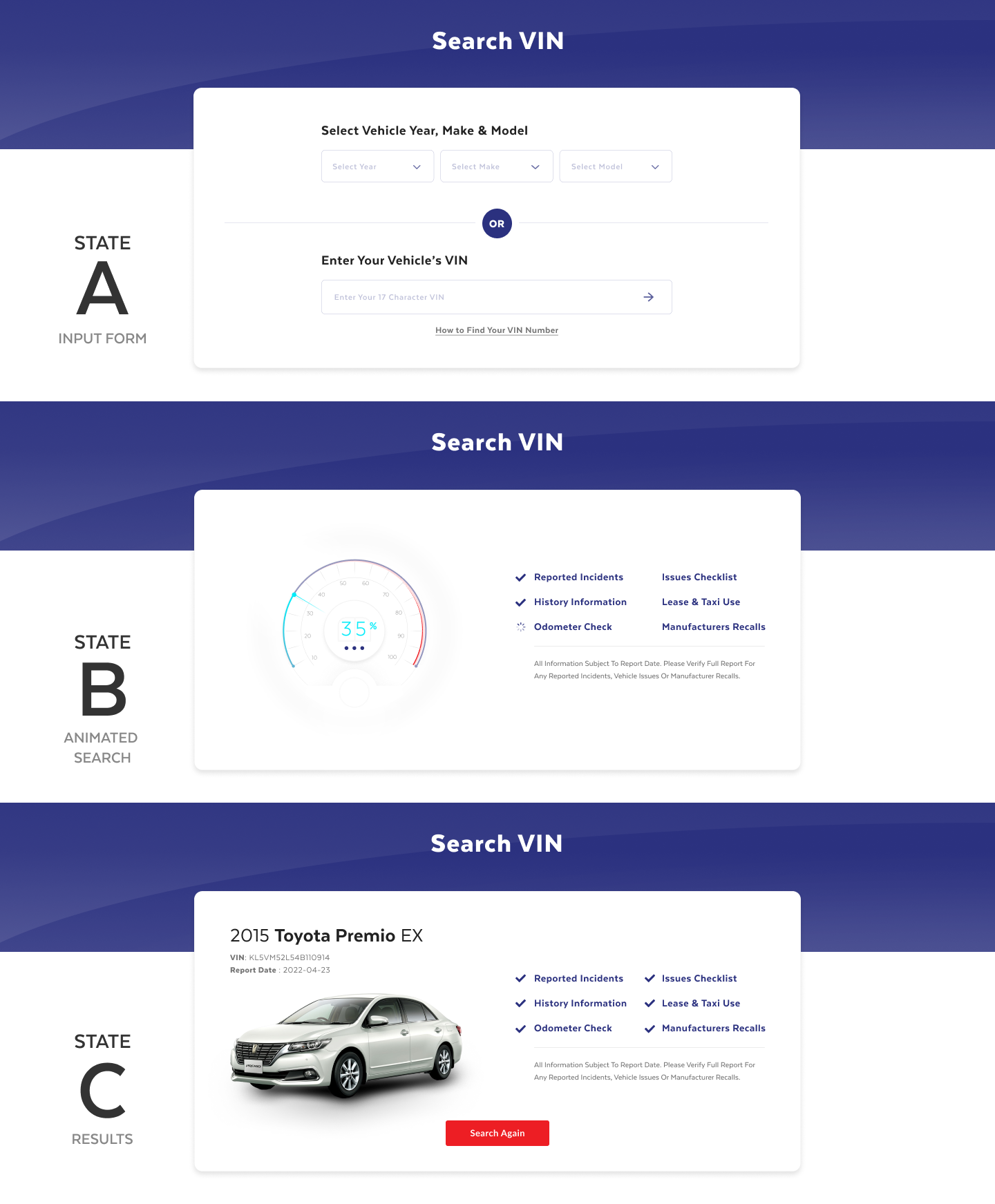VIN Search Page : users enter valid VIN numbers, the search graphic indicates the search assembles appropriate data, while the last frame returns the associated vehicle statistics.